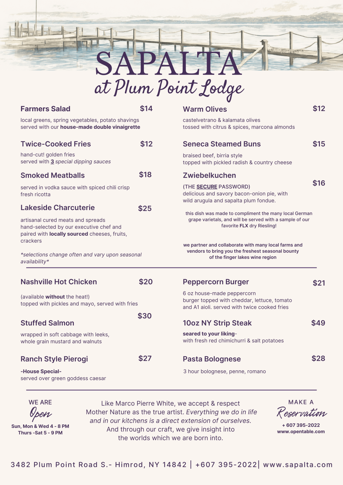 Dinner Our opening day is April 10 2026! please join us by calling direct or reserving a spot on OpenTable app.